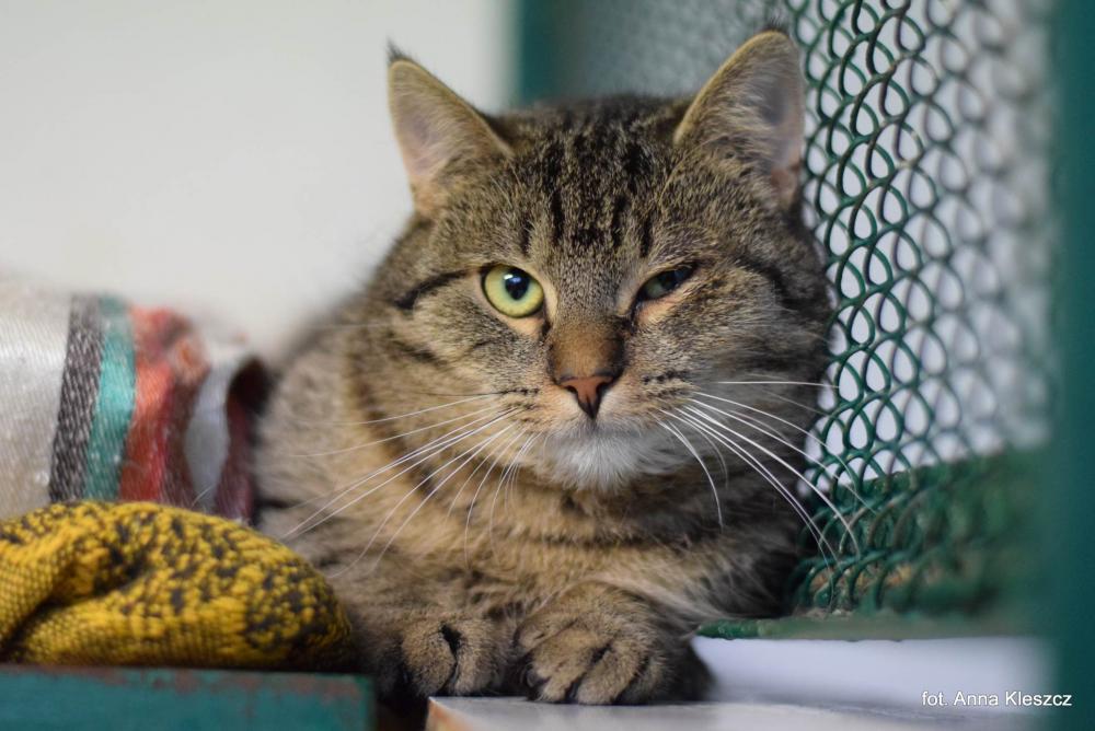 SZANTUŚ jest ok. 9-miesięcznym kocurkiem, który do schroniska trafił w drugiej połowie 2022 roku, znaleziony wcześniej w Grzywnie (gmina Chełmża). W zasadzie od początku zyskał miano rezydenta, czekał tylko na zabieg kastracji i potrzebną profilaktykę, by zamieszkać w dużej kociarni. Jednak, jak dobrze wiemy, koty nigdy nieszczepione mają słabą odporność i Szantuś kilkukrotnie u nas chorował, między innymi na koci katar. Szczęście w nieszczęściu, można rzec, bo już taki dziki jak na początku to on nie jest :) Nasz piękny burasek nie ma w sobie ani odrobiny agresji, ale nie jest jeszcze typowym kocim miziakiem. Jest bardzo spokojny, opanowany, kocha kocie towarzystwo, które w nowym domu jest bardzo mile widziane (często poprzez inne koty możemy zdobyć zaufanie strachulca). Aktualnie Szantuś jest po dwóch szczepieniach przeciwko chorobom zakaźnym, został wykastrowany, a po szczepieniu przeciwko wściekliźnie zamieszka w głównej kociarni schroniska. Niestety, jak pisaliśmy na początku, w tłumie kotów może zniknąć :( Szantuś jest naprawdę fajny i wiemy, że jeśli ktoś z Państwa zechce dać mu szansę, kocurek wykorzysta ją, a odrobina pracy sprawi, że poza człowiekiem nie będzie widział świata :) Zdjęcie: Anna Kleszcz Opis: Ola Glib UWAGA! Opis został sporządzony na podstawie obserwacji kota w warunkach schroniskowych. Niektóre zachowania mogą się powielać w domu, inne się ujawniać, a jeszcze inne nie powtórzyć.