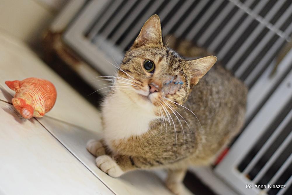 WAZOWSKI to ok. 2-letni kocurek, który trafił do nas prosto z pogotowia weterynaryjnego. Przywieziony tam został przez ludzi, którzy go znaleźli – przedstawiał sobą obraz nędzy i rozpaczy: perforacja gałki ocznej oraz ogólne wyczerpanie, rokowania na przyszłość były bardzo niepewne. Kot wymagał szybkiej operacji, której w jego stanie raczej by nie przeżył. Na szczęście to niezwykle dzielny i pozytywny kot – to naprawdę niesamowite! Obecnie, 2 tygodnie od przyjęcia (trafił 23.03.2025), kot jest ładnie zaokrąglony, po paskudnej ranie gałki ocznej nie ma już śladu, a my zaczynamy szukać mu domu. Został też już przez nas wykastrowany. Zrównoważony i obdarzony wrodzonym optymizmem, Wazowski nadaje się jako towarzystwo dla osób potrzebujących wsparcia emocjonalnego lub stymulacji ruchowej. Nasz jednooki pupilek może zamieszkać z małymi dziećmi oraz innymi zwierzętami. Może to kwestia właśnie tego, że ma tylko jedno oko, ale mamy wrażenie, że Wazowski widzi tylko jasną stronę życia... ;) Obecnie, czyli od kwietnia do października, od poniedziałku do soboty, jesteśmy otwarci do godziny 18:00. Zapraszamy! :) Zdjęcie: Anna Kleszcz Opis: Hortensja UWAGA! Opis został sporządzony na podstawie obserwacji kota w warunkach schroniskowych. Niektóre zachowania mogą się powielać w domu, inne mogą się ujawniać, a jeszcze inne nie powtórzyć.
