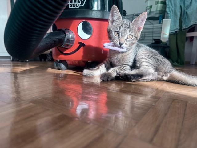 Jaśniejszy chłopczyk – jak wszystkie kociaki lubi jeść i bawić się z rodzeństwem. Jest szybki i ma super refleks. Nie odpuści żadnej rzeczy leżącej na ziemi – wszystko jest przecież dobre do zabawy i przenoszenia w pyszczku, nawet jeżeli jest trzy razy większe od niego :P Najsprawniejszy wspinacz ze wszystkich trzech łobuzów. Uwielbia głaski – byle nie za długo, bo on jest bardzo zajęty poznawaniem świata."